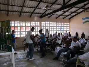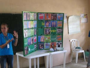 Meanwhile the teens of the school, the girls resplendent in their plaid Uniforms and the boys in white shirts and jeans, gathered in classrooms playing sexual health quiz games under the supervision of Profamilia peer educators. The kids ranged from 15 to 20 in age. There were variations of the Concentration game with questions on sexual health. The kids were divided into four teams for each event, with wonderful names like the Crocodiles, the Divine Ones, and the Pirates. There was great good-natured competition among them. When one team got a wrong answer, a boy and girl from the team had to dance the salsa in front of the class. I told them that I considered it a reward! Lots of hilarity. I was not invited to dance. Another punishment was to have the entire team stand with their backs to the class and shake their rear ends – Planned Parenthood does the hokey-pokey!