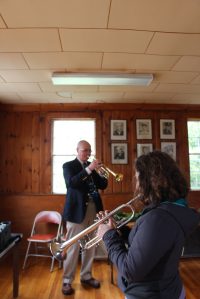Two trumpeters stay inside the Legion Hall quietly warming up – blowing a trumpet in 46-degree weather takes real expertise.