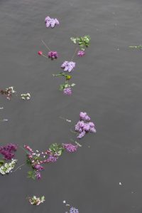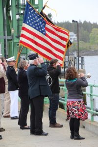 Seagulls scatter to a safe distance. An elderly female veteran throws a wreath into the sea. A bugler – a teacher at the local school – blows taps. A second bugler – the minister doing double duty – on an adjacent pier blows an echoing taps. The children throw their lilacs and wildflowers into the harbor, parents holding on to their coattails so that they don’t follow the flowers into the cold waters. The veterans march proudly back to their hall.