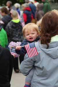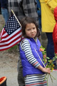 It is 9:15 and the veterans depart their shelter to assemble at the far end on Main Street, joining an awaiting gaggle of island school children carrying American flags and flowers. Parents hold the hands of the younger ones. One mother pulls her infant daughter in a red Radio Flyer wagon. The island children, antsy at the best of times, are subdued, one hopes awed by the solemnity of the occasion, or perhaps the result of a severe lecture on proper decorum from their parents.